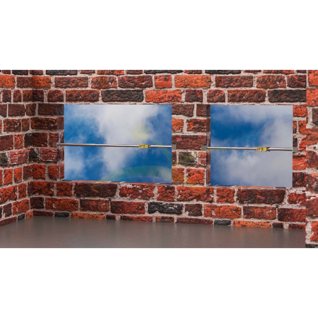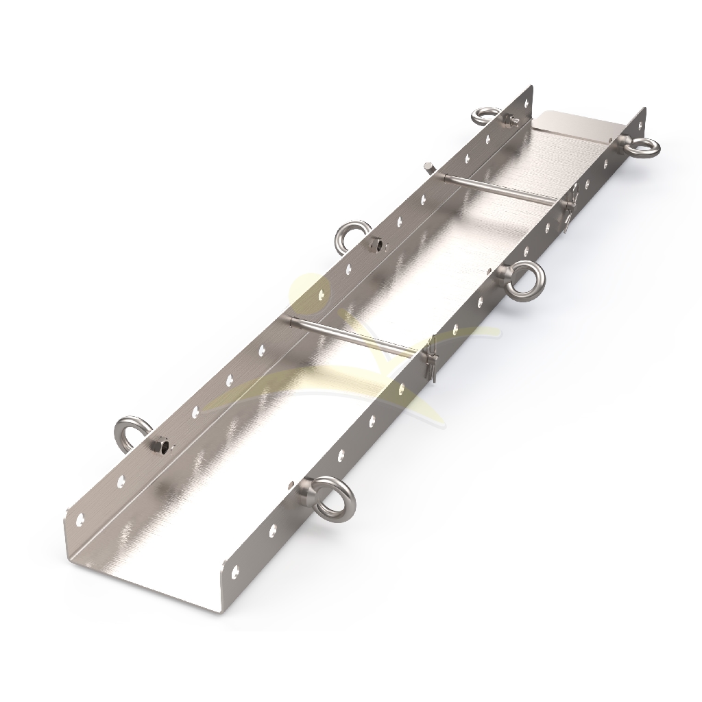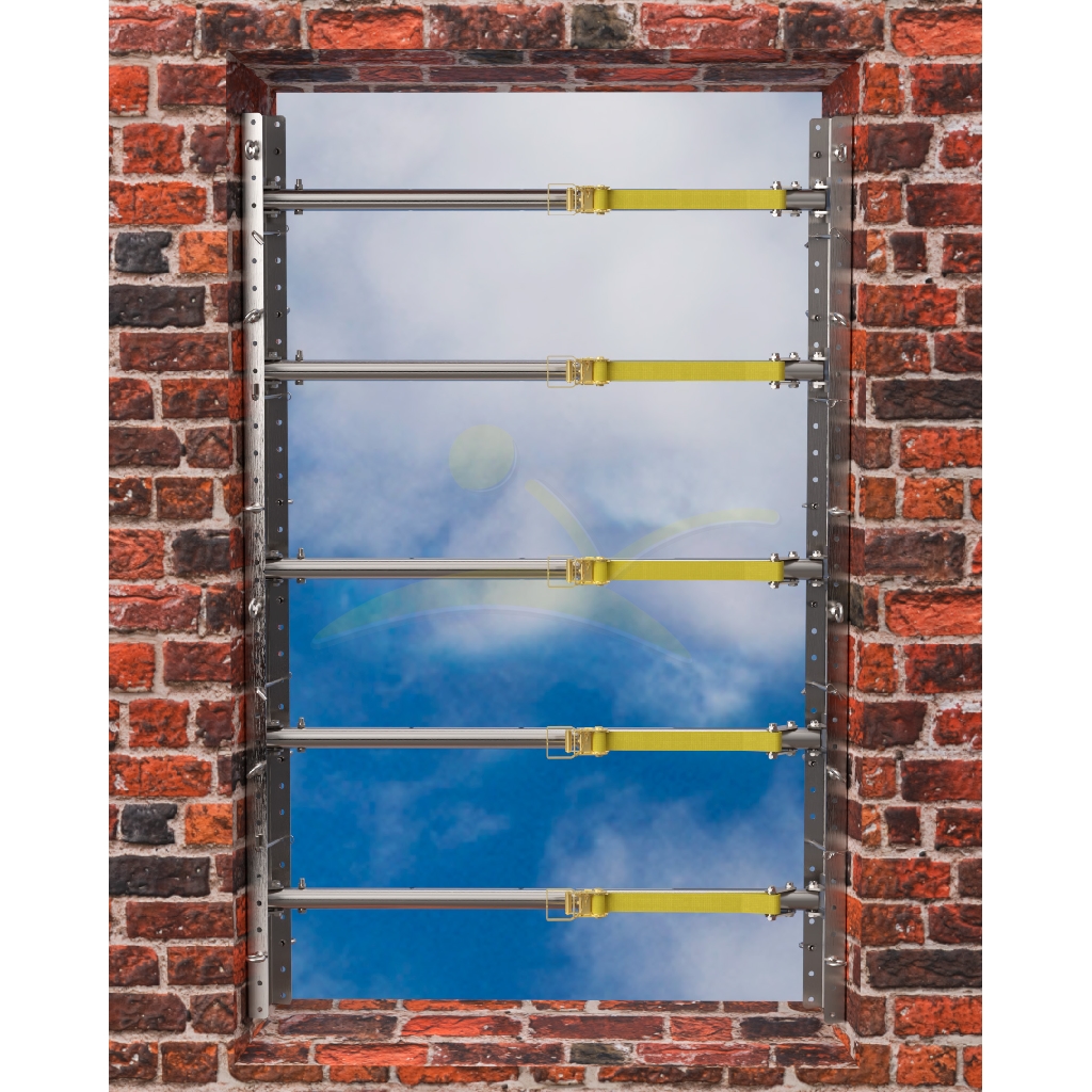 Dispositivo de protección provisional para la prevención de caídas en trabajos en altura. Se fija temporalmente al marco de la ventana o a estructuras resistentes, actuando como barrera de seguridad en huecos abiertos. Fabricado en material metálico resistente y conforme a normativa vigente.